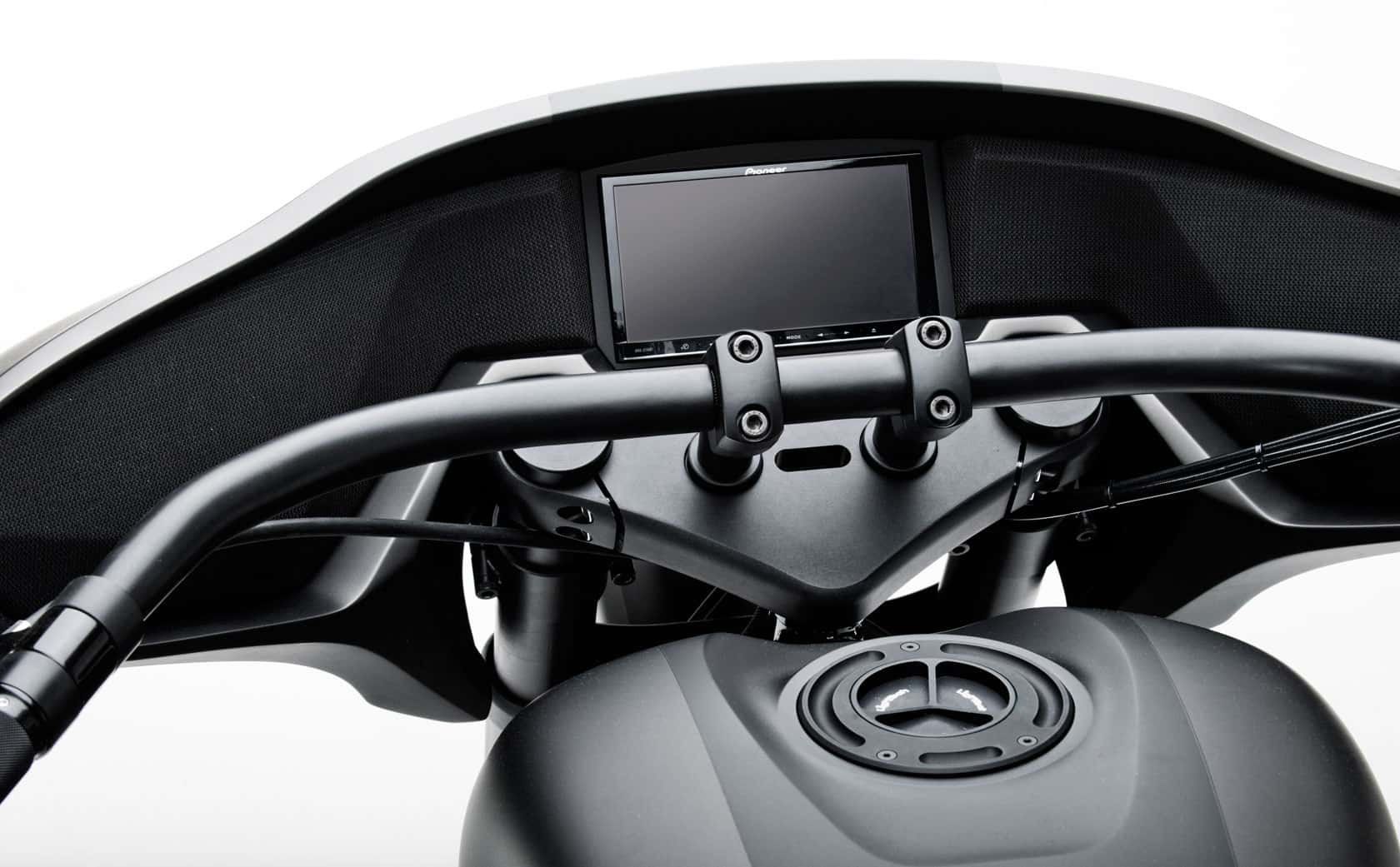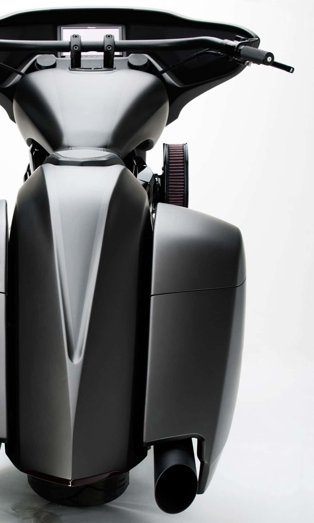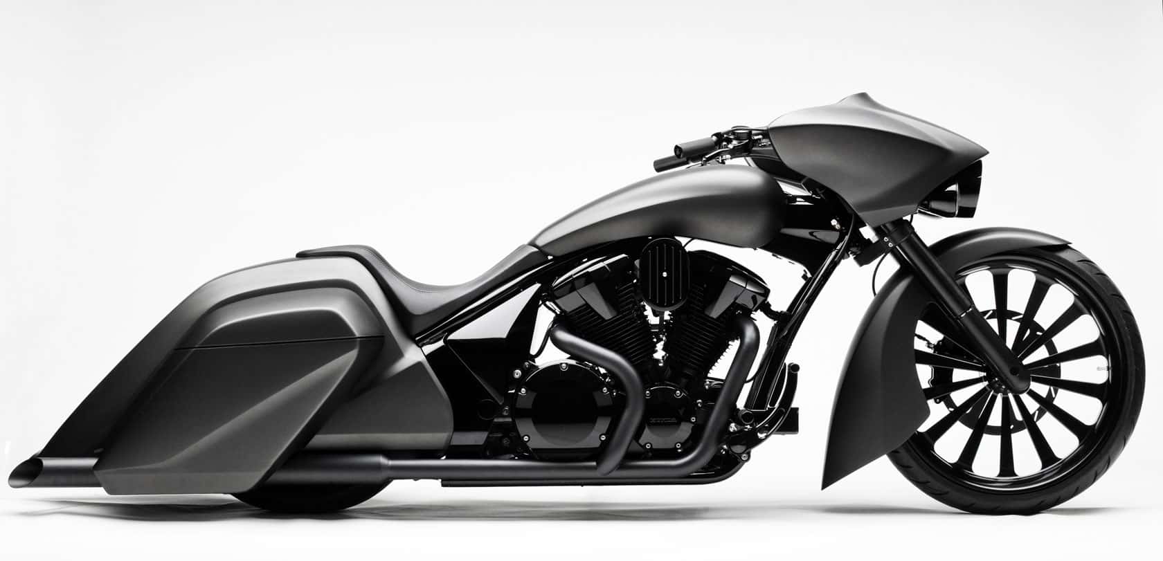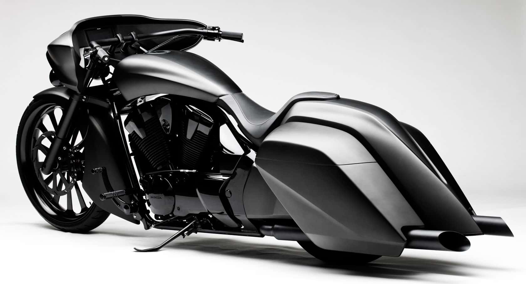 Based on a 2010 Stateline, designer Erik Dunshee (Honda R&D Americas) reveals the life of low. Fueled by elegance and power the Slammer sports a fully adjustable air-ride suspension, NAV/Multimedia, 10″ subwoofer and 500 watts of power. With a full front end conversion, including a lean 23″ custom wheel, the designer achieved all this without frame or engine modification. Low has never looked so good.