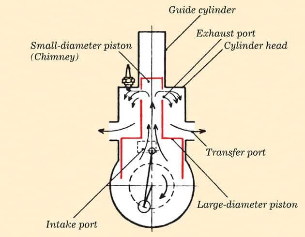 The nickname given this engine–the “chimney”–still remains. As it suggests, both the piston and the cylinder head had a long protrusion on top, and there was an unusual central scavenging system, making for a most unconventional 2–stroke design. No such engine had ever been used on a motorcycle before.