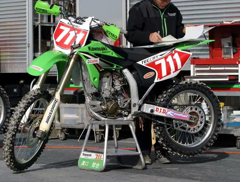 We were all treated to this spy shot on March 26, 2004 over a year before this model was to be produced. New 2005 Kawasaki KX450F is a 4 valve twin-cam engine, which is a Kawasaki only affair, and it has an all new aluminum frame.
