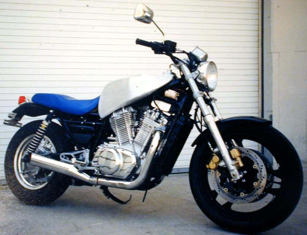 ” I’d like to say that the VX 800 was my brainchild, but actually Sam and Aki were the inspired R&D engineers who started putting together a crude prototype at the Brea Studio utilizing a 750cc Intruder engine in a modified Intruder frame. The rake and trail were of course modified on that prototype, as were the footpeg / shifter