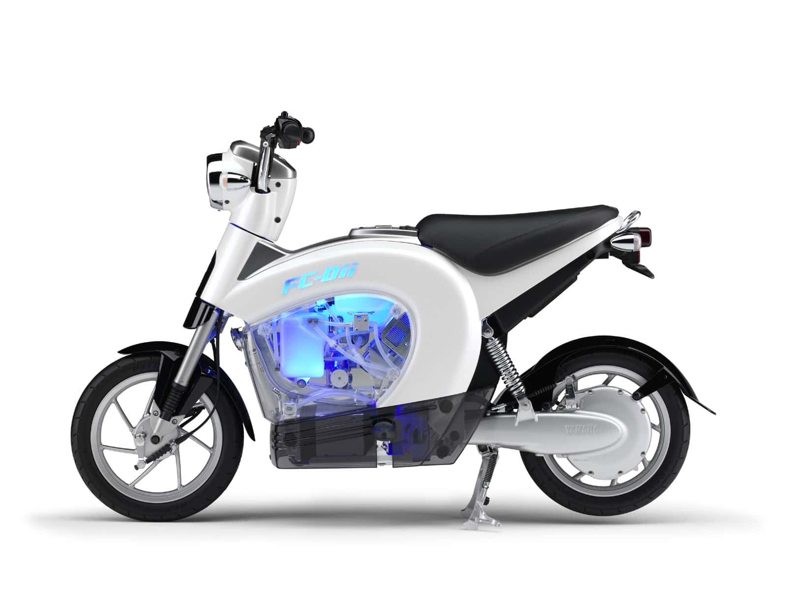 This model is a further evolution of the FC-me fuel cell motorcycle using a methanol-water solution with 54% methanol (by mass) as fuel, unveiled in Sept. 2005 with significant performance improvements. This new version is enhanced with new features including: (1) a Yamaha-exclusive compact cell stack that features the highest level of power density in the 1kW class, (2) a detachable lithium-ion battery for easy recharging, (3) modular design components, readily available parts and improved serviceability aimed at achieving practical use and (4) a fuel cell system which achieves a top-level performance of 30% system efficiency for a DMFC (Direct Methanol Fuel Cell) system. The development of this model has been assisted with some funding from the New Energy and Industrial Technology Development Organization (NEDO).