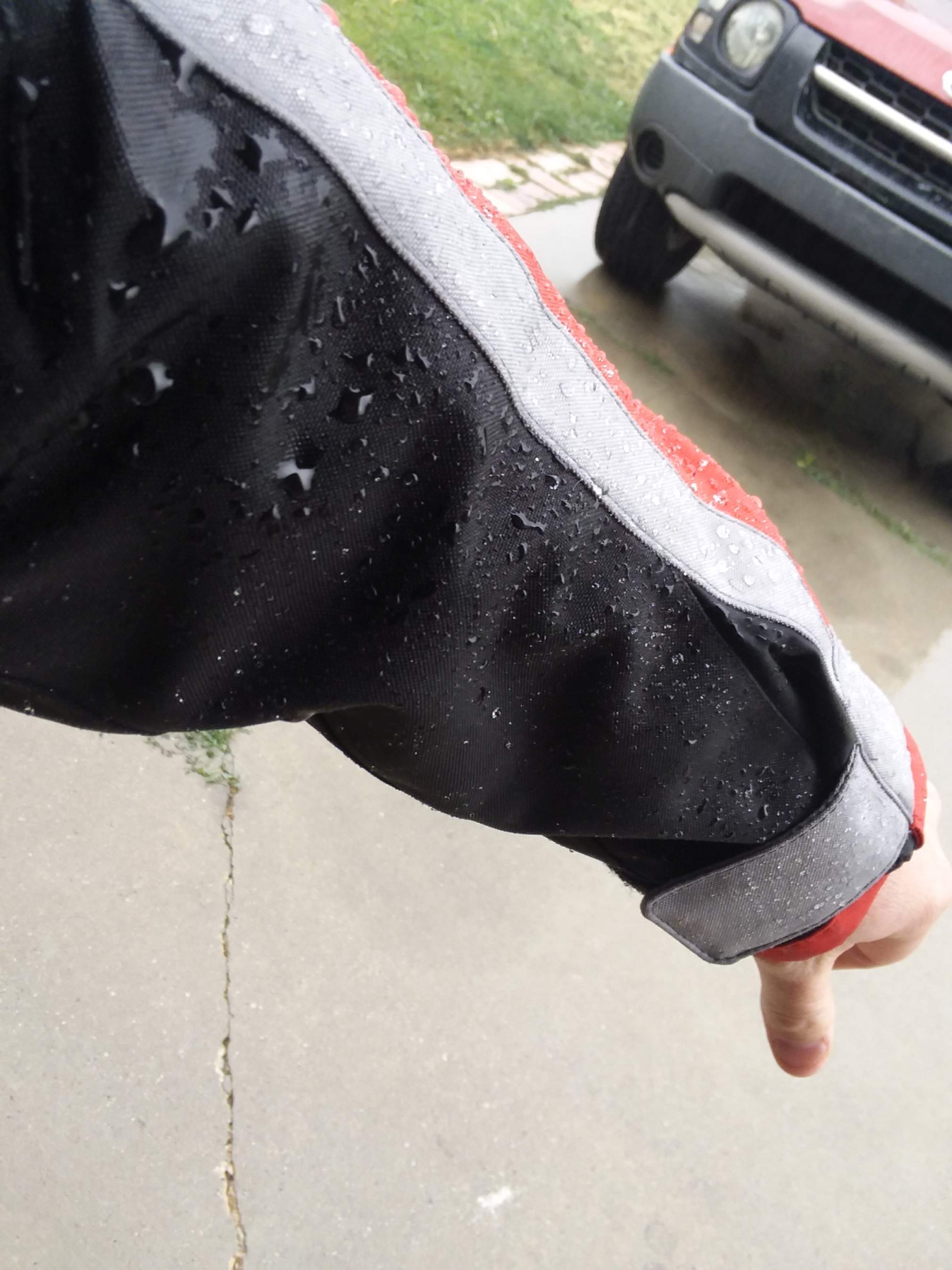 One of the most unique features about the Optima Jacket is that it’s waterproof without the liner. The entire construction is laminated fabrics and sealed seams, and the front closure features dual overlapping zippers with plackets. Just close the intake and exhaust vents and you can ride worry-free through a downpour. I say that with confidence. During the first week of October, remnants of Hurricane Rosa brought unseasonably cool temperatures and heavy rainfall to Northern Utah. Rather than hide from them, I donned my Scorpion gear and went out to see how they held up. As you can see from the pictures, the rain was very intense. I shipped not a drop through the jacket though.