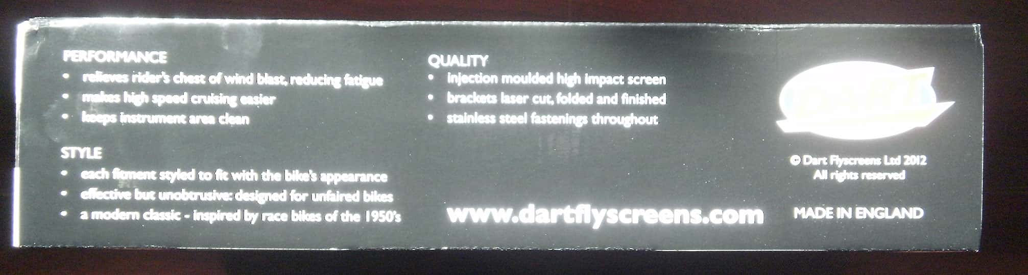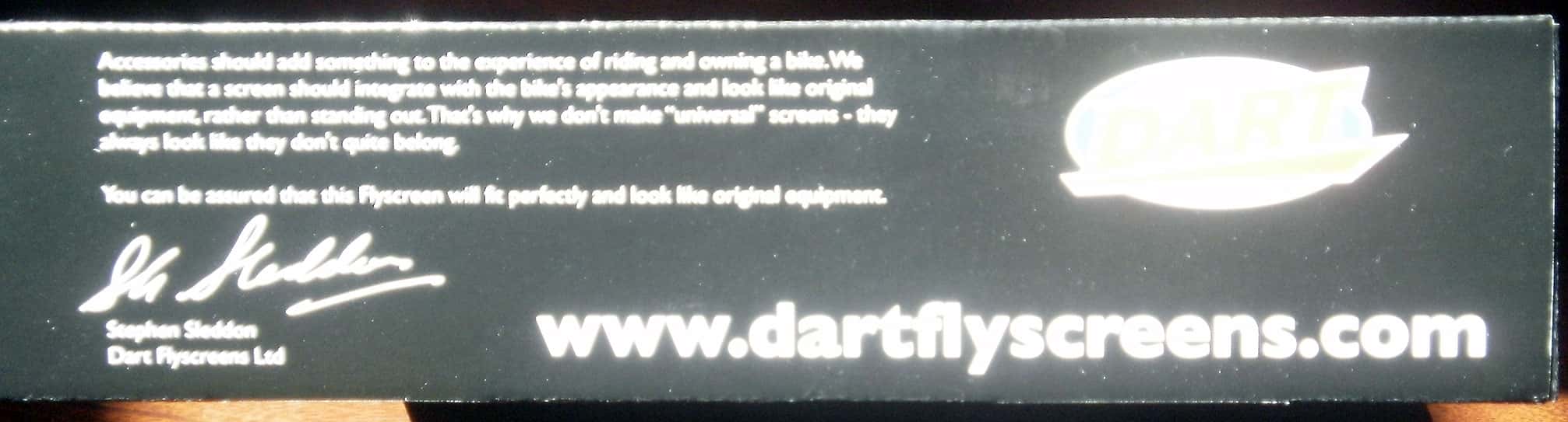 The original Dart flyscreen was designed and developed in 1995 specifically for the Ducati Monster series. Every year since then we’ve been improving our product and extending the range. The major innovation came in 2005, when we changed from thermoforming to injection-moulding. All the major motorcycle manufacturers use injection-moulding because it gives a superior product: for example, look at the polished bead around the screen, and the recessed areas for the fittings. Dart is the only aftermarket screen manufacturer who use injection-moulding for all their screens.