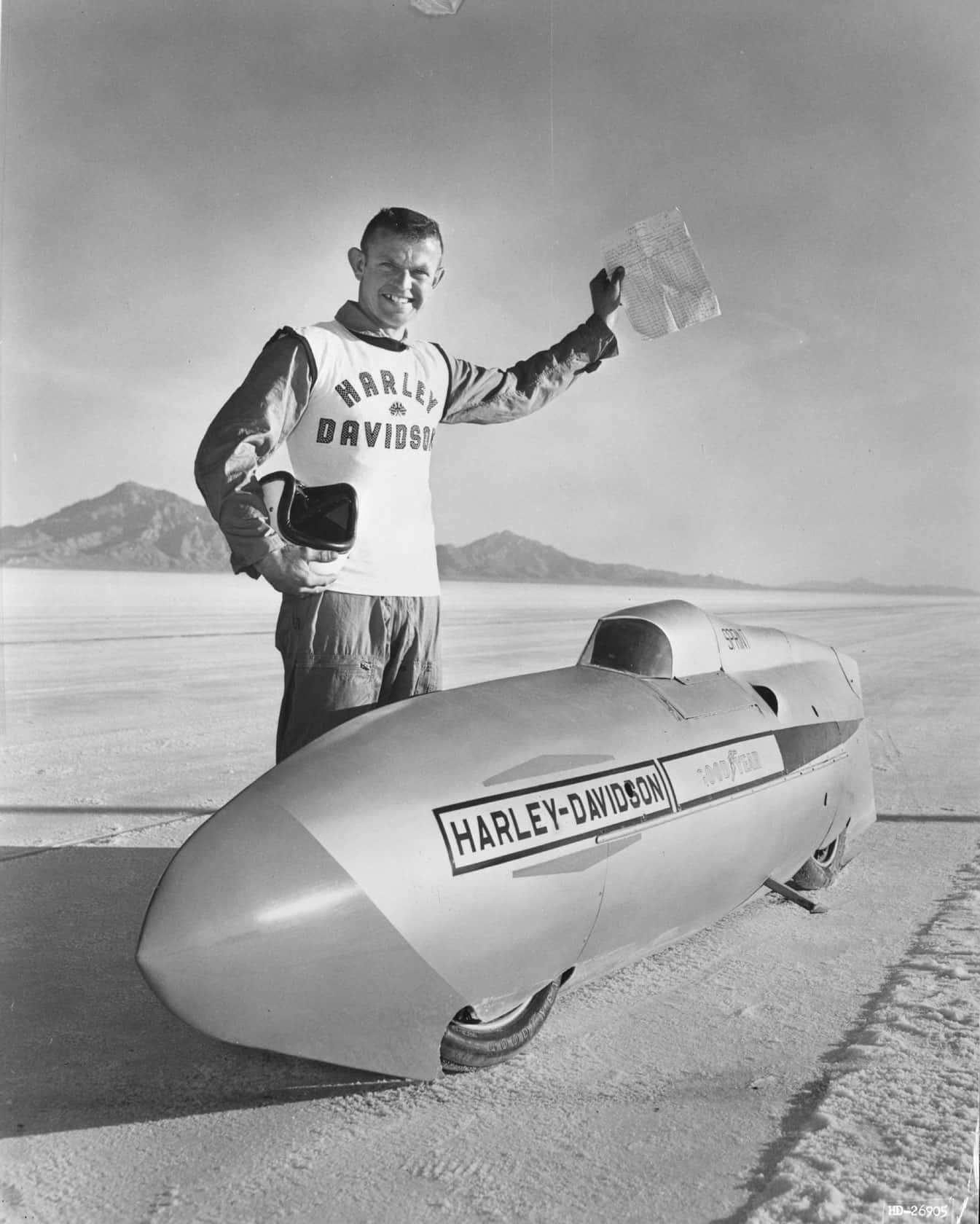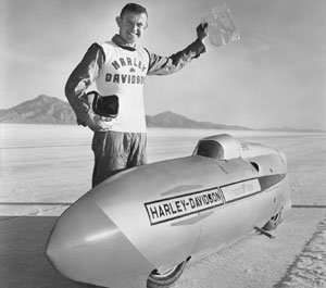 In a Streamliner powered by a 250cc Sprint CR racing engine, George Roeder shatters the speed records for Class A and Class C runs, averaging 177 miles per hour |
