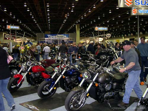 Also, I stopped by “the Boulevard” to see the new cruiser line. Interestingly, when talking with other show spectators in regards to this new line of bikes, the one thing that seemed to stump everyone was Suzuki’s use of cubic inches for engine size description, when the majority of people had gotten used to using cubic centimeters as their reference. I heard it over and over again – what is a “90” in cc’s? Is this bad marketing? We’ll see. It seems as if they are trying to catch the Harley market with this whole routine.