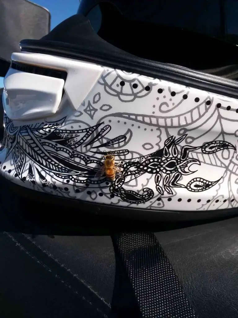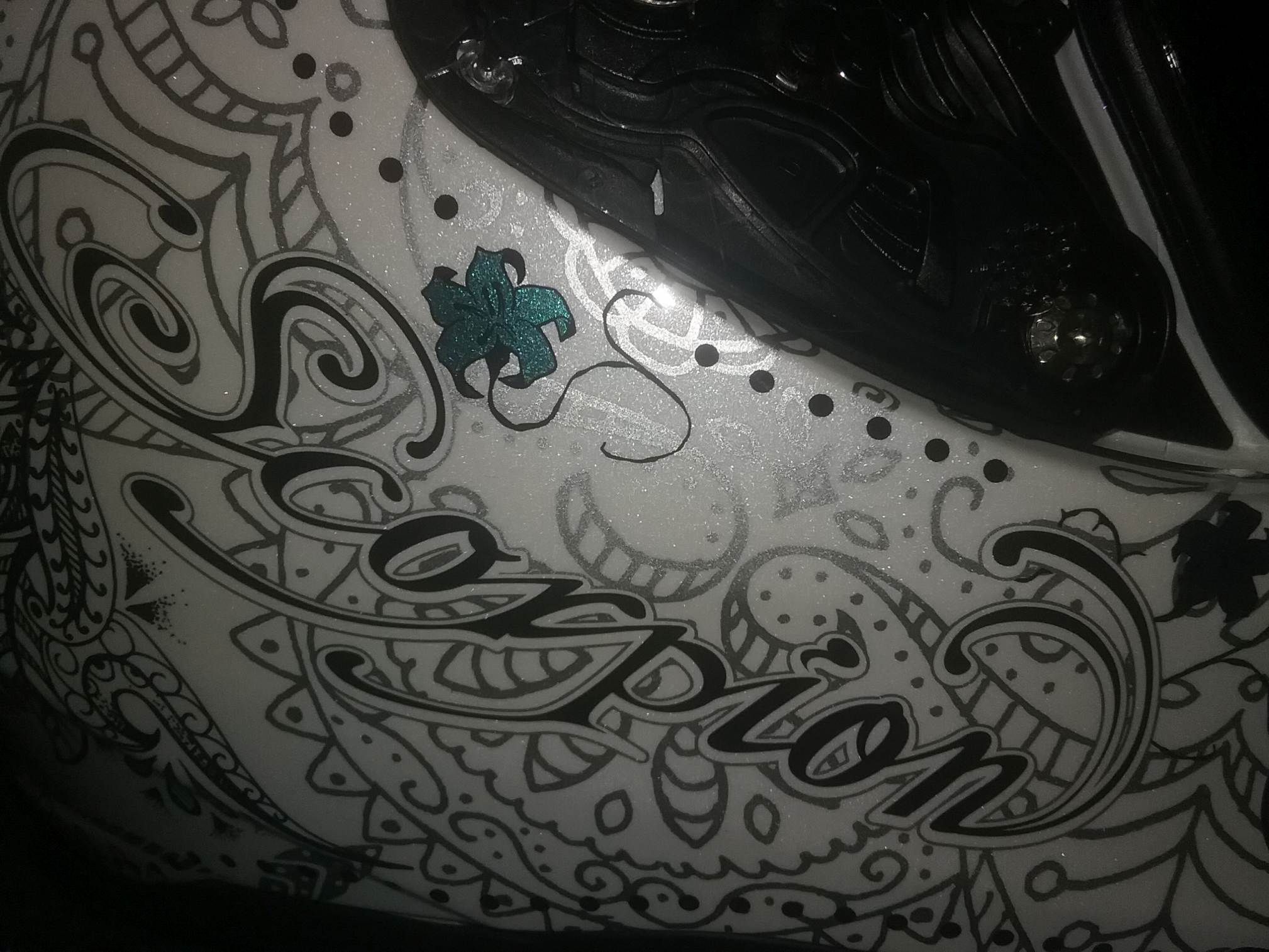 The first thing I can say about the Scorpion EXO-T510 Azalea is it’s so gorgeous. The Azalea is offered in two color schemes Black/Gold and the one I received White/Silver. While I’ve always been a fan of black, I’m really impressed with the White and Silver combination. It’s bright and shimmery. Onlookers can see it from afar. It sparkles in the sunlight and beams when it’s overcast and looks amazing just sitting on my work desk. Tribal designs are all the rage right now and Scorpion nailed it with the Azalea design. Color matching doesn’t get any easier than with classic black on white or metallic tones on black. In addition the design includes little hologram style flowers to achieve just the right amount of feminine expression without overdoing it. The Azalea can be paired with any assembly of riding gear and goes great with your bike regardless of color.