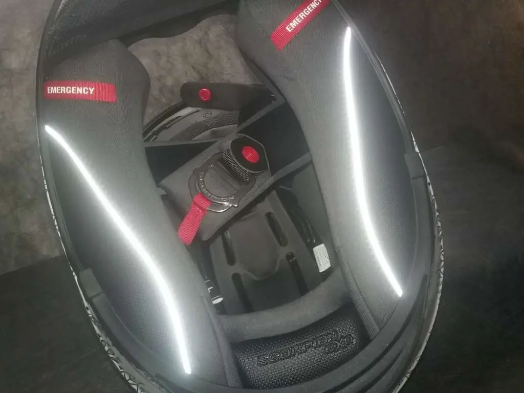 The padding inside my Scorpion Azalea is plush and soft (and washable! A blessing for hot summer head sweat and excess make-up foundation build up). The chin strap easily adjusts to perfect fit and I forget it’s there. My helmet fits tight. My head measurement (around my head at the temple above my eyebrows) is 22.5 inches which would indicate a Medium size per the fitment chart on Scorpion’s Website. I went up a size and requested a Large to accommodate my hair in a French braid, ponytail or bandanna. While the tight fit doesn’t give me a headache or leave red marks on my face, I’m more than a little excited to put more wear and tear on my liner. My head just needs a little more space. Regrettably I wasn’t really able to make much use out of the liner inflation system.