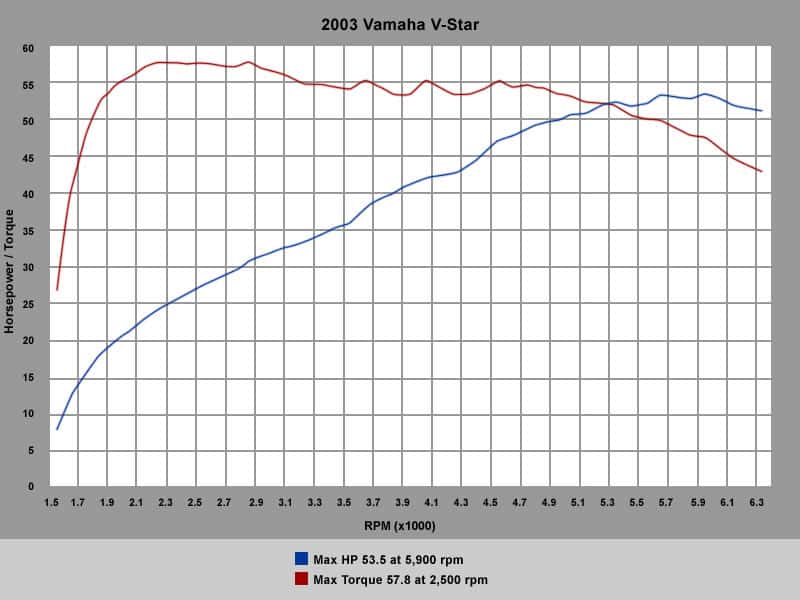 Yamaha V-Star 1100 → 53.5 hp @ 5900 RPM, 57.8 ft/lbs @ 2500 RPM