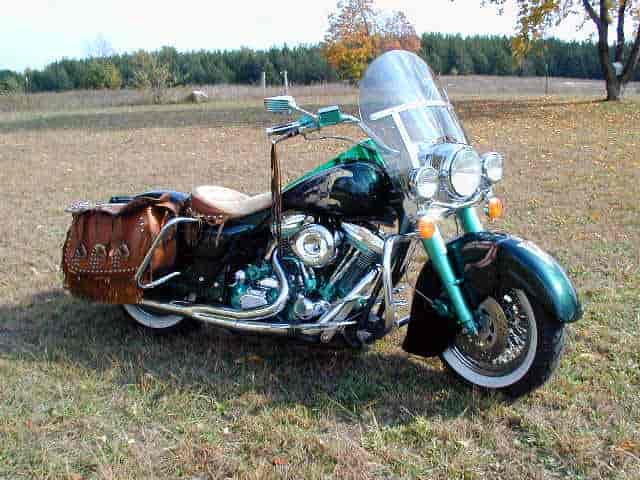 Custom 1994 HD ROADKING customized in 1997. Only one like it in the world. I built the bike in 1997 using a western theme. Two Tone green, tank & fenders are hand painted,”not airbrushed” custom made horseshoe floor boards and shifting levers, custom made grips, tan seat & saddle bags.Font wheel is an Halmark diamond 80 spoke self-balancing. Rear wheel is a chrome mag type. All steel braided cables. The bike has been lowered approx. 3″ front & back. Engine is an 80 CI with S&S “Hot Set Up” dyno-ed @75HP. Thunder Header exhaust. TOP